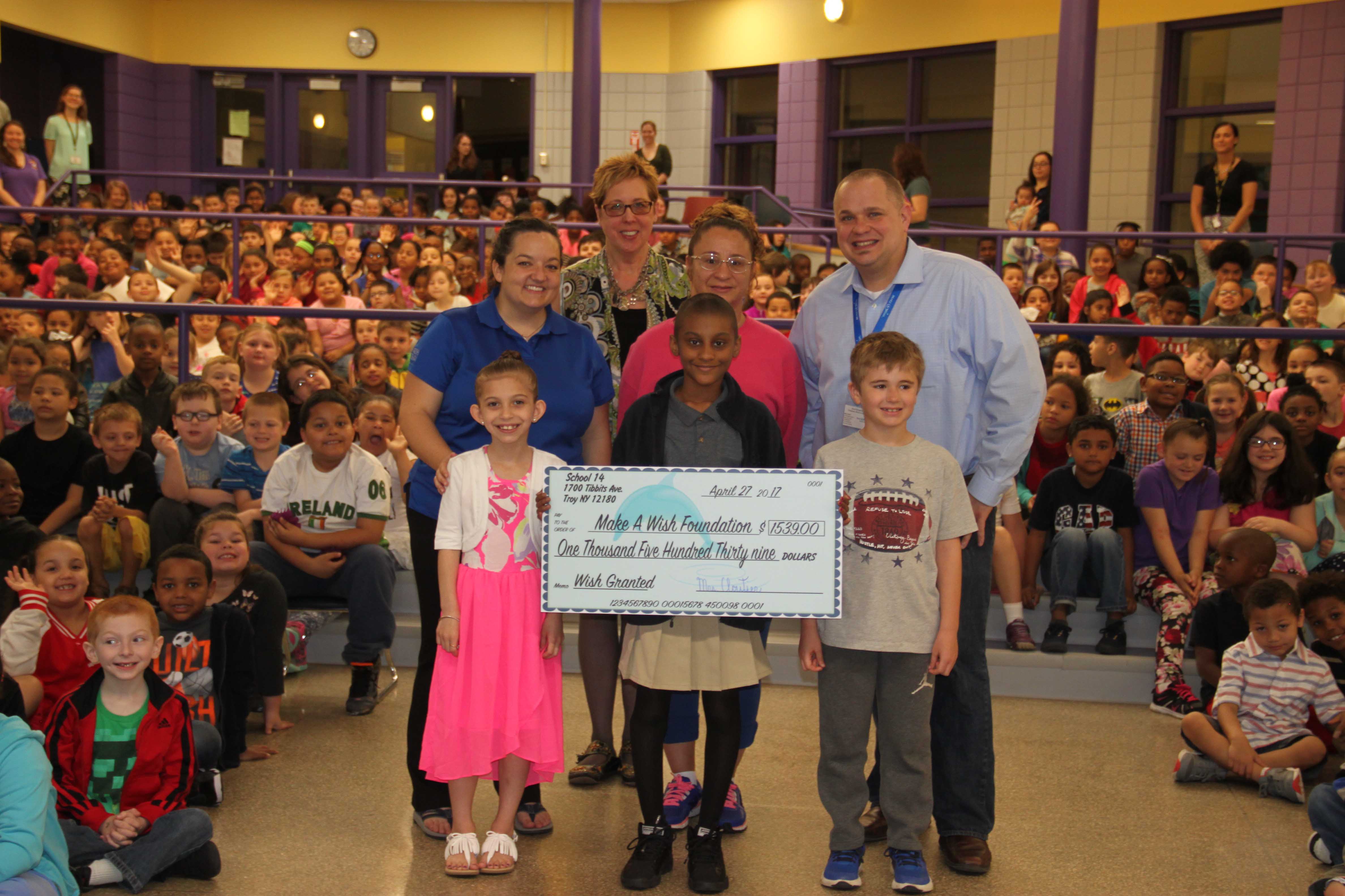 On April 27, the students of Troy’s School 14 presented a check to the Make-A-Wish Foundation in the amount of $1,539. Students raised the funds themselves by collecting spare change and by asking for donations. Students also had an opportunity to meet the child whose wish was granted by the money they donated the previous year.