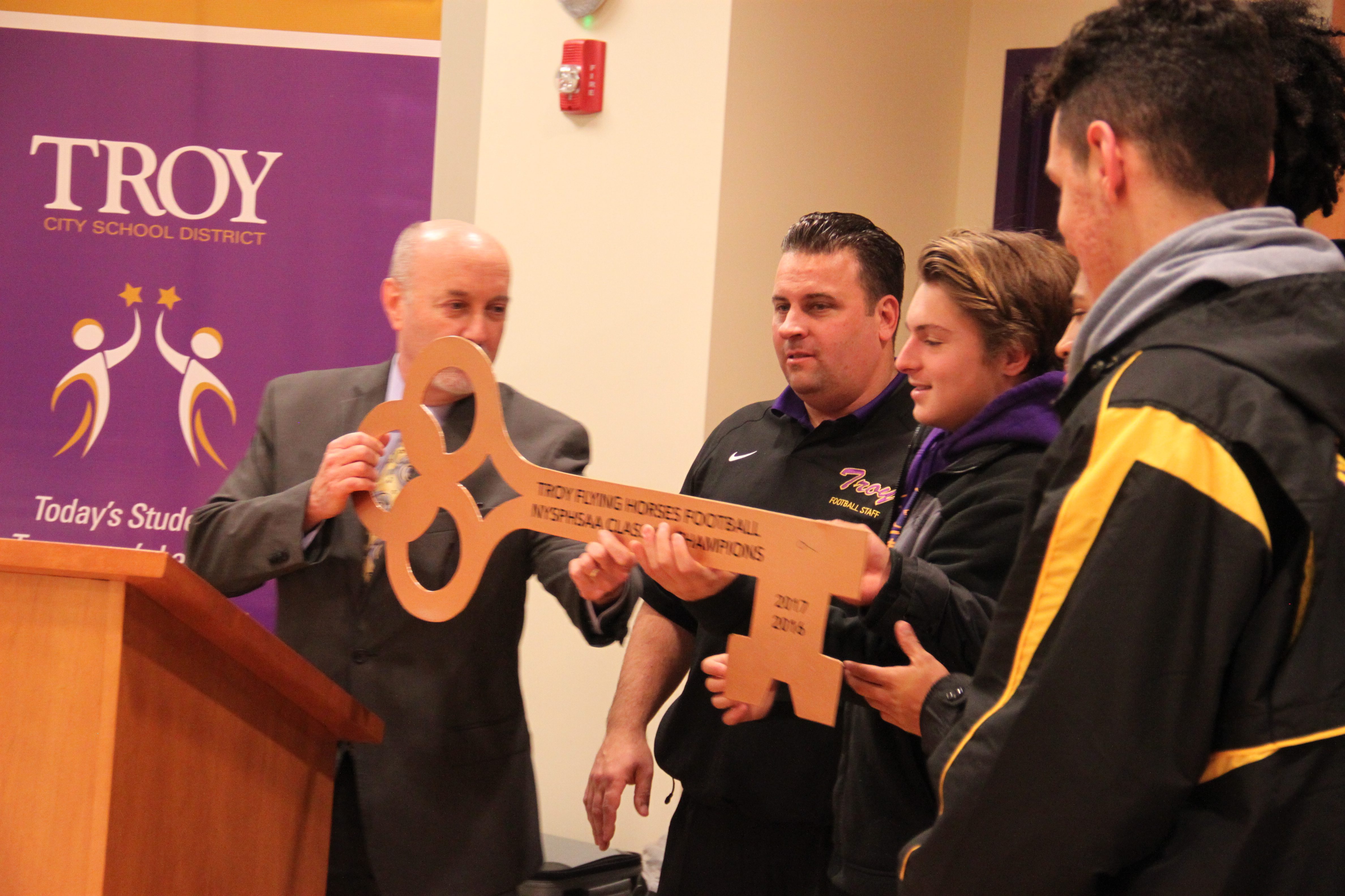 During the January 3 Board of Education Meeting, the 2017 Troy High School Football team was honored by several area politicians for their second consecutive state championship win in November. City of Troy Mayor Patrick Madden also presented the key to the city to the team in recognition of their win.