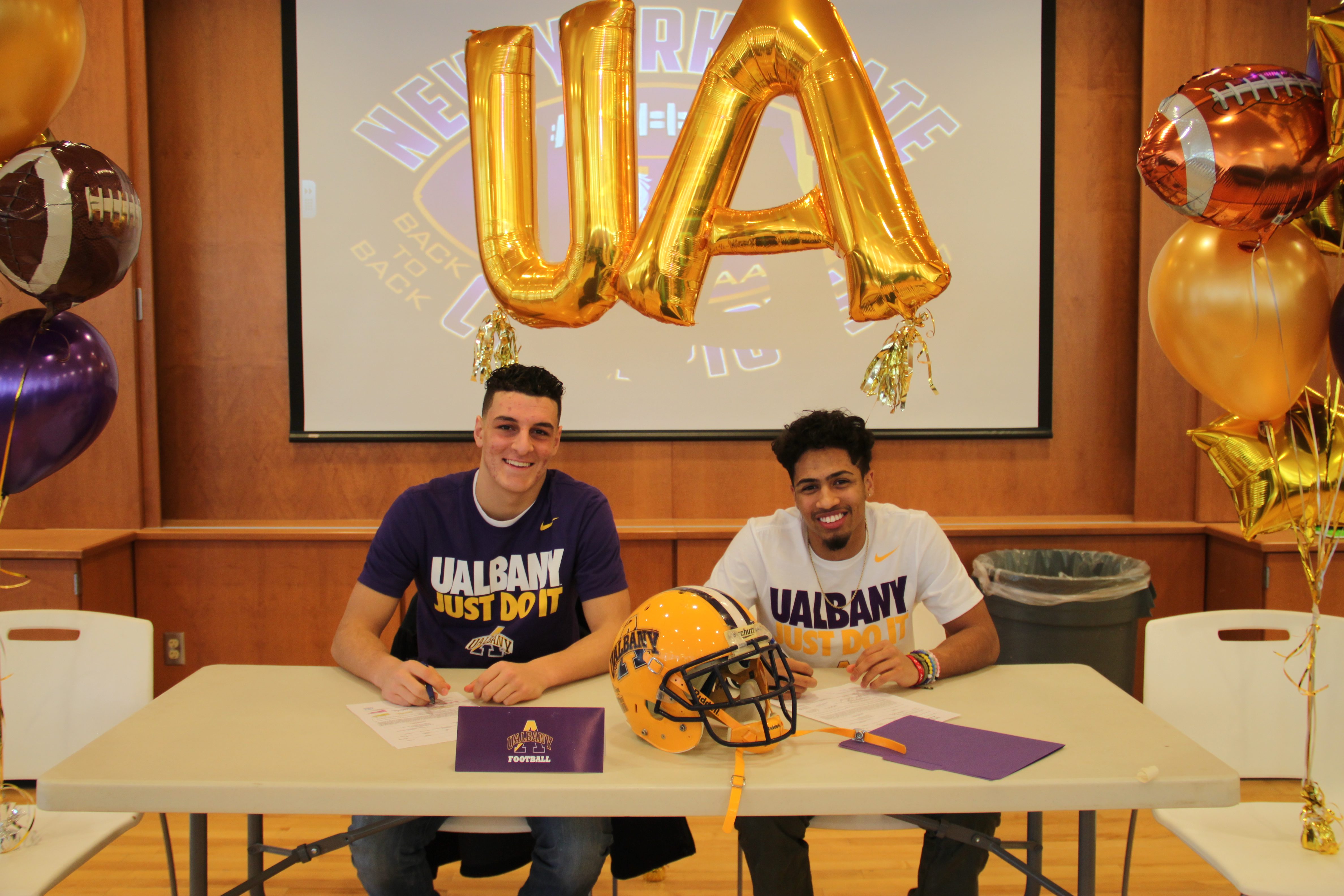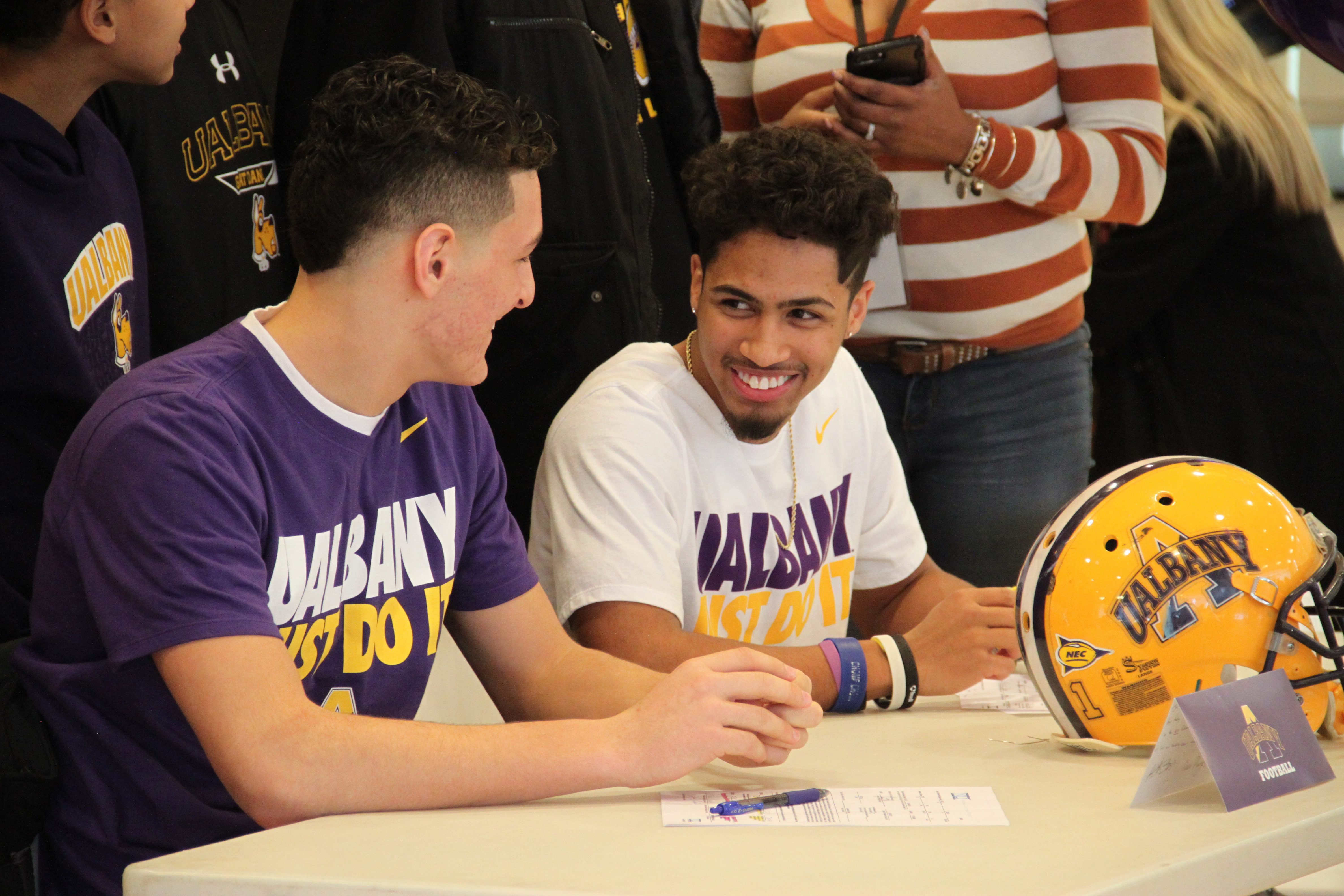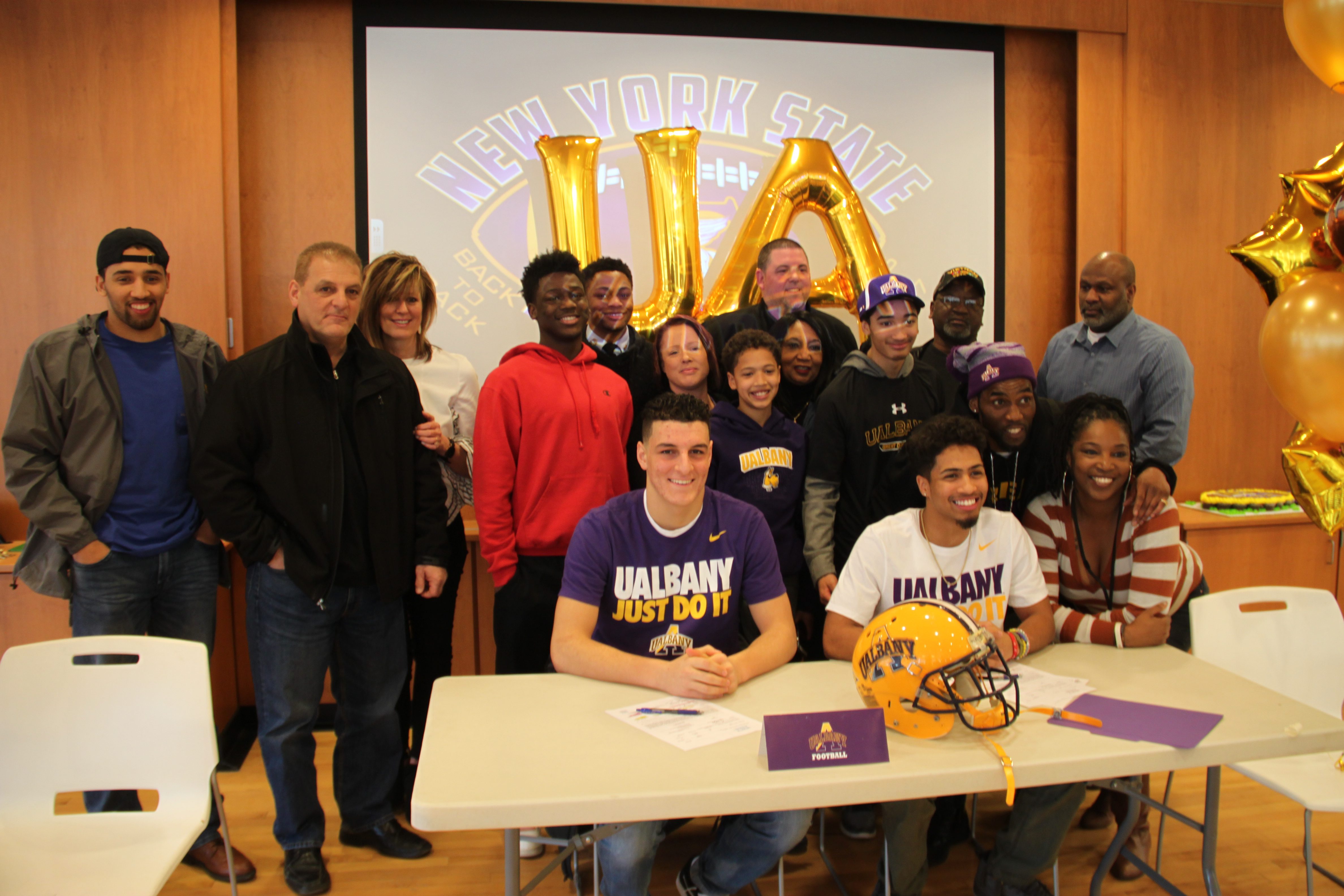 On February 13, surrounded by their family, friends and coaches, Troy High School seniors Joeseph Casale and Devenaire Holmes signed their National Letters of Intent to play football for the University at Albany. UAlbany’s football team is part of the Colonial Athletic Association and the University has been ranked among the top universities in Forbes’ “America’s Best Public Colleges.”