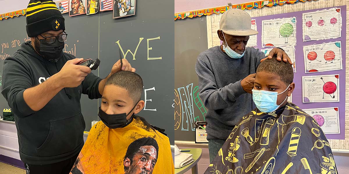 Ron Peterson and Donald Ravenell donated their time to provide free haircuts to School 2 students on Dec. 20.