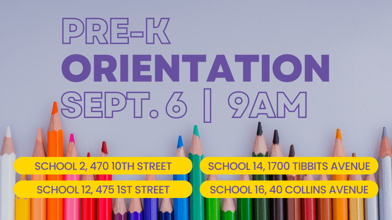 Pre-K orientation for the 2022-2023 school year is scheduled for Tuesday, September 6 at 9:00 a.m. at your elementary school (School 2, 12, 14 and 16). Please attend the session at the school your child will be attending.
