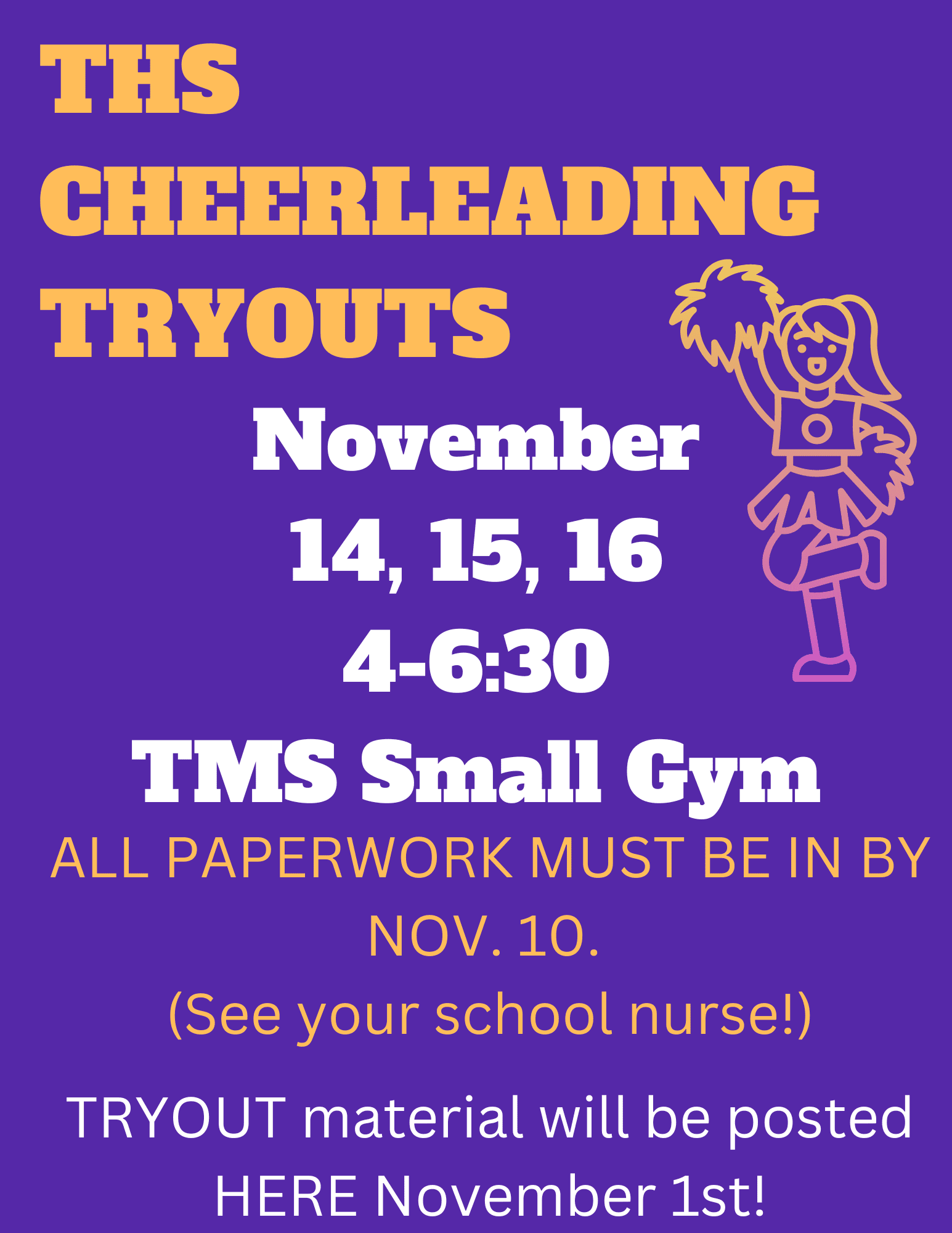 THS Winter Cheerleading Tryouts will be held on November 14, 15 and 16 from 4:00 – 6:30 in the TMS Small Gym. All paperwork must be submitted by November 10. Please see your school nurse for the required forms.