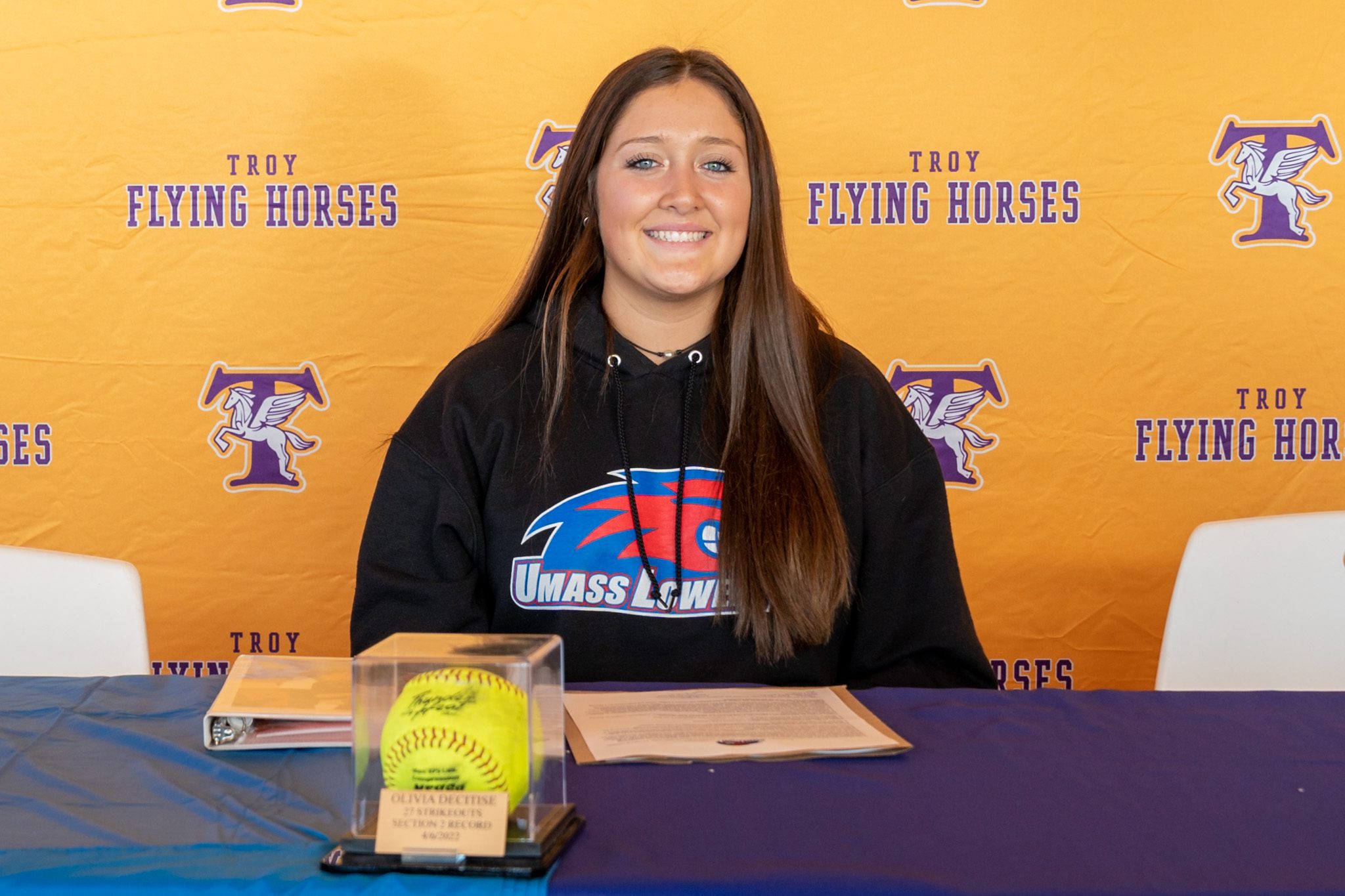 On November 9, Troy High Senior Olivia DeCitise signed a national letter of intent to play Division I softball at UMass Lowell next year in a signing ceremony in the Troy Room at Troy Middle School.