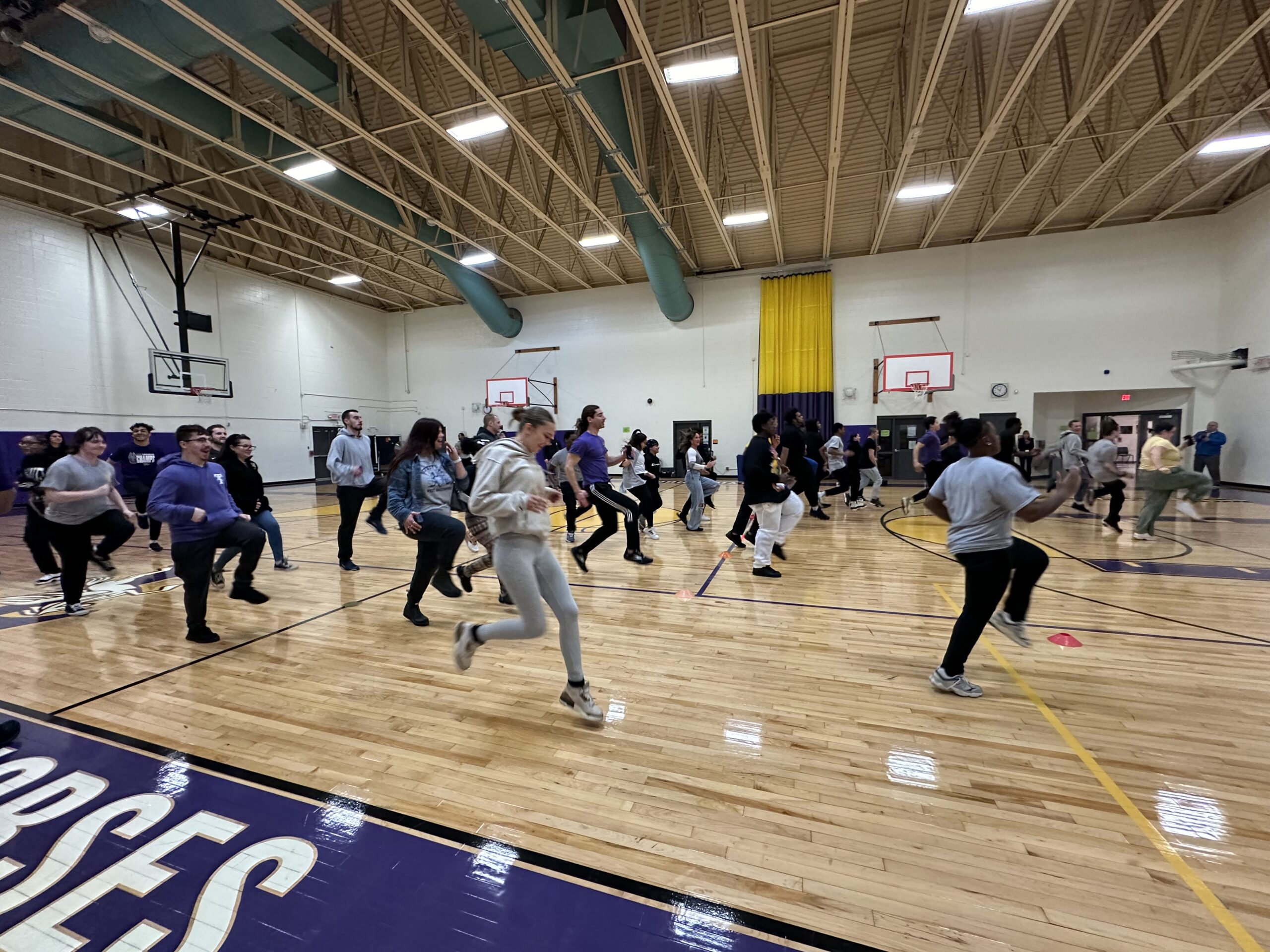 Nearly all students and staff participated in dynamic stretching and then progressed to tackling, agility and cone drills while learning about the importance of proper conditioning while having a great time together.