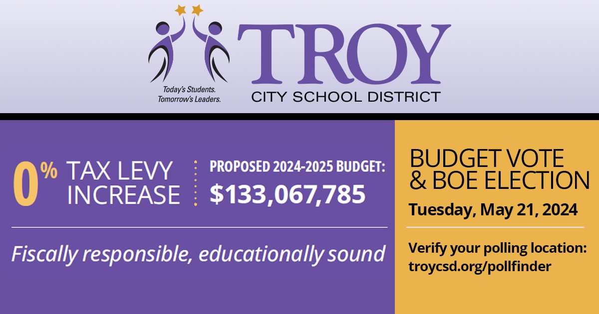 Please note – if you previously voted at School 16, you will vote at Carroll Hill School on May 21. Many Troy election districts have recently changed. Please verify your voting location here.