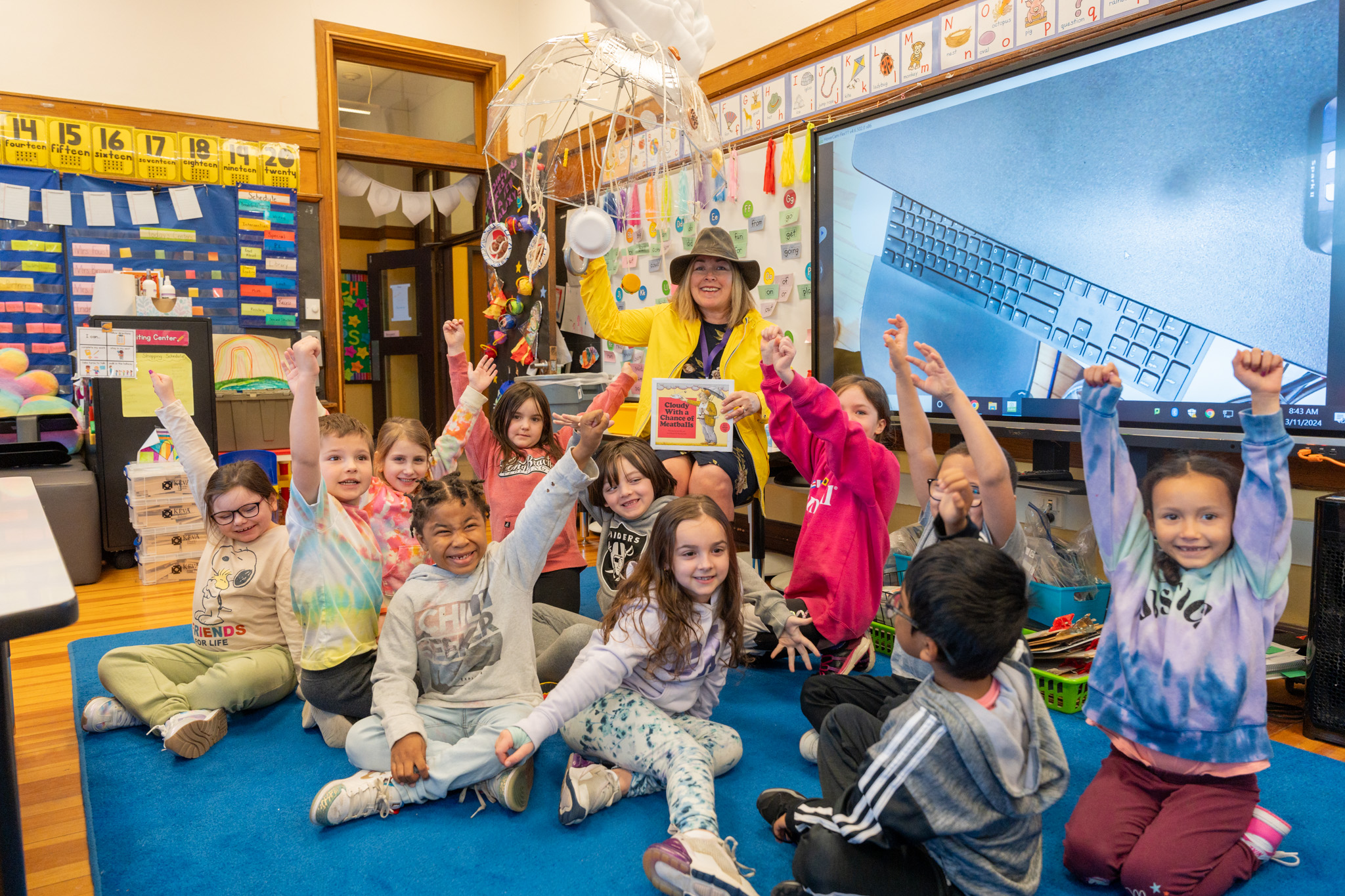 Dr. Watson read “Cloudy With a Chance of Meatballs” to students for Read Across America Day in March 2024.
