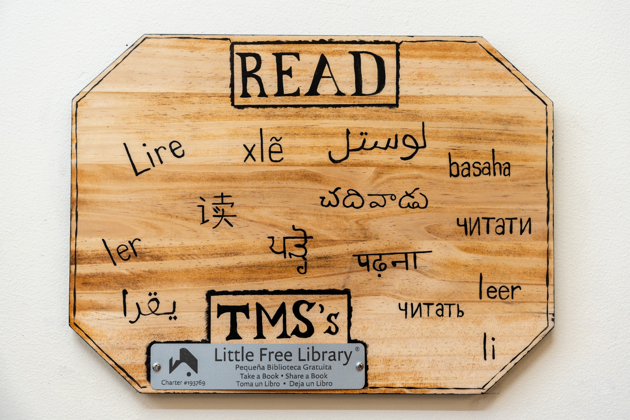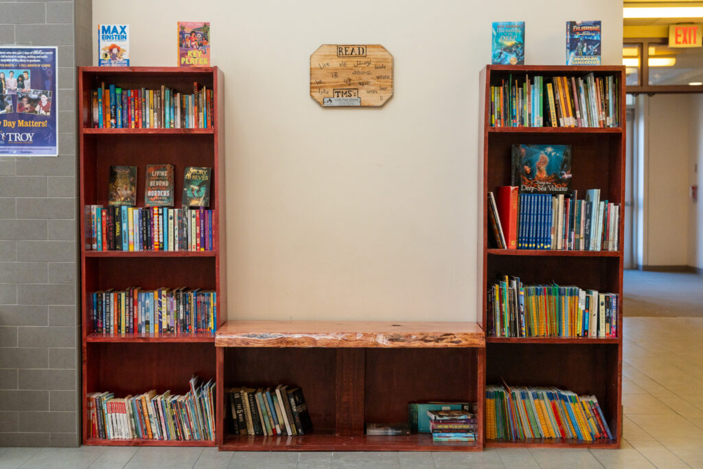 Built by Troy High School technology students and filled with books from TMS PTO book drives, any student is welcome to find a book on the new shelves. Also part of the library – a sign engraved with the word “read” in each language spoken by TMS students.