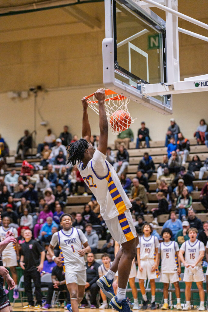 Sophomore Jerdarius Green hangs on the rim after a two handed dunk in Troy’s 74-52 win over BHBL in the Section 2 Quarterfinals.