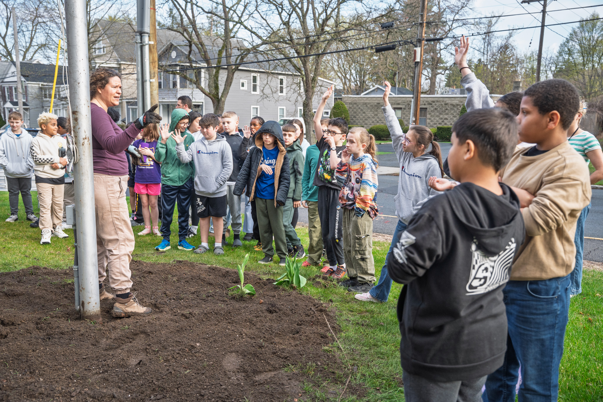 School 16 fifth-graders planted flowers and cleaned up trash around the building to celebrate Earth Day