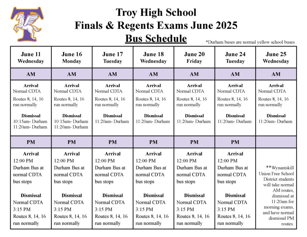 The last day of classes at Troy High School is Friday, June 13. Students who are scheduled to take a Final Exam or Regents Exam are to report to school on the days/times below. Please note – June 10 is a normal school day for all THS students. Regular breakfast and a limited lunch will be served every exam day. Transportation information is listed below the exam schedule. The review class schedule is also available here.
