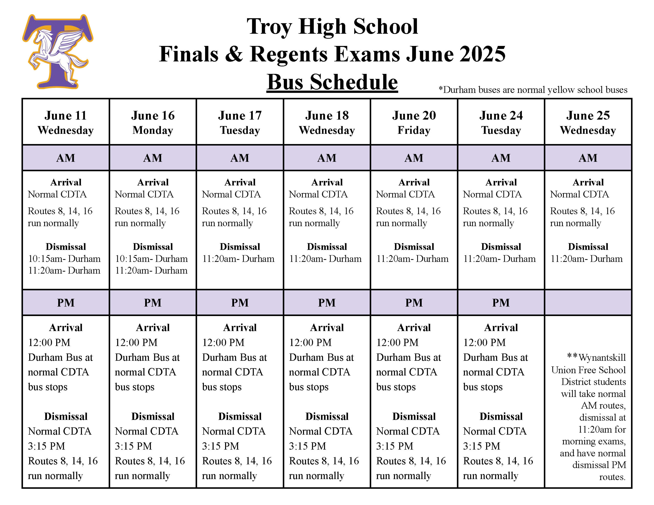 *Wynantskill UFSD students will take normal AM routes with dismissal at 11:20 a.m. for morning exams and have normal PM dismissal routes.