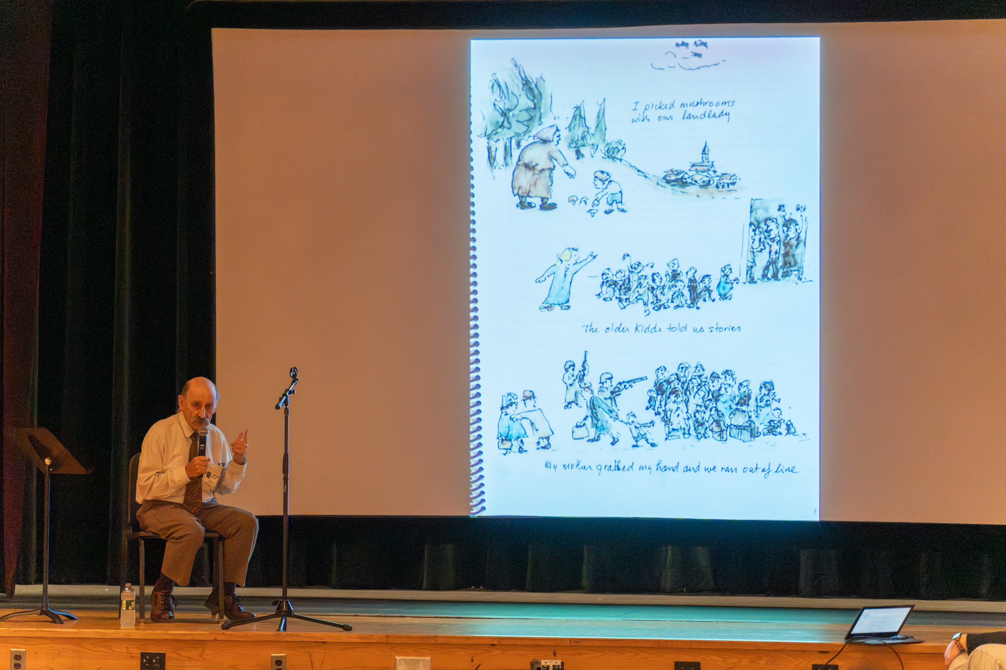 Holocaust survivor Ivan Vamos shares his personal story with Troy Middle School eighth graders, using illustrated pages to depict memories from his childhood.