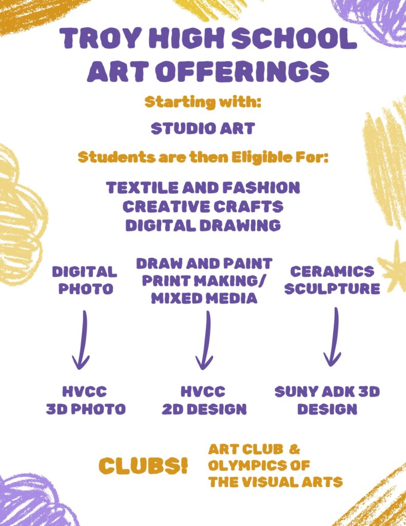After taking Studio Art, students are eligible to take Textile and Fashion, Creative Crafts, and Digital Drawing. Other courses with pre-requisites include: HVCC 3d Photo (digital photography), HVCC 2D Design (Draw and Paint Print Making/Mixed Media), and SUNY Adirondack 3D Design (Ceramics Sculpture)